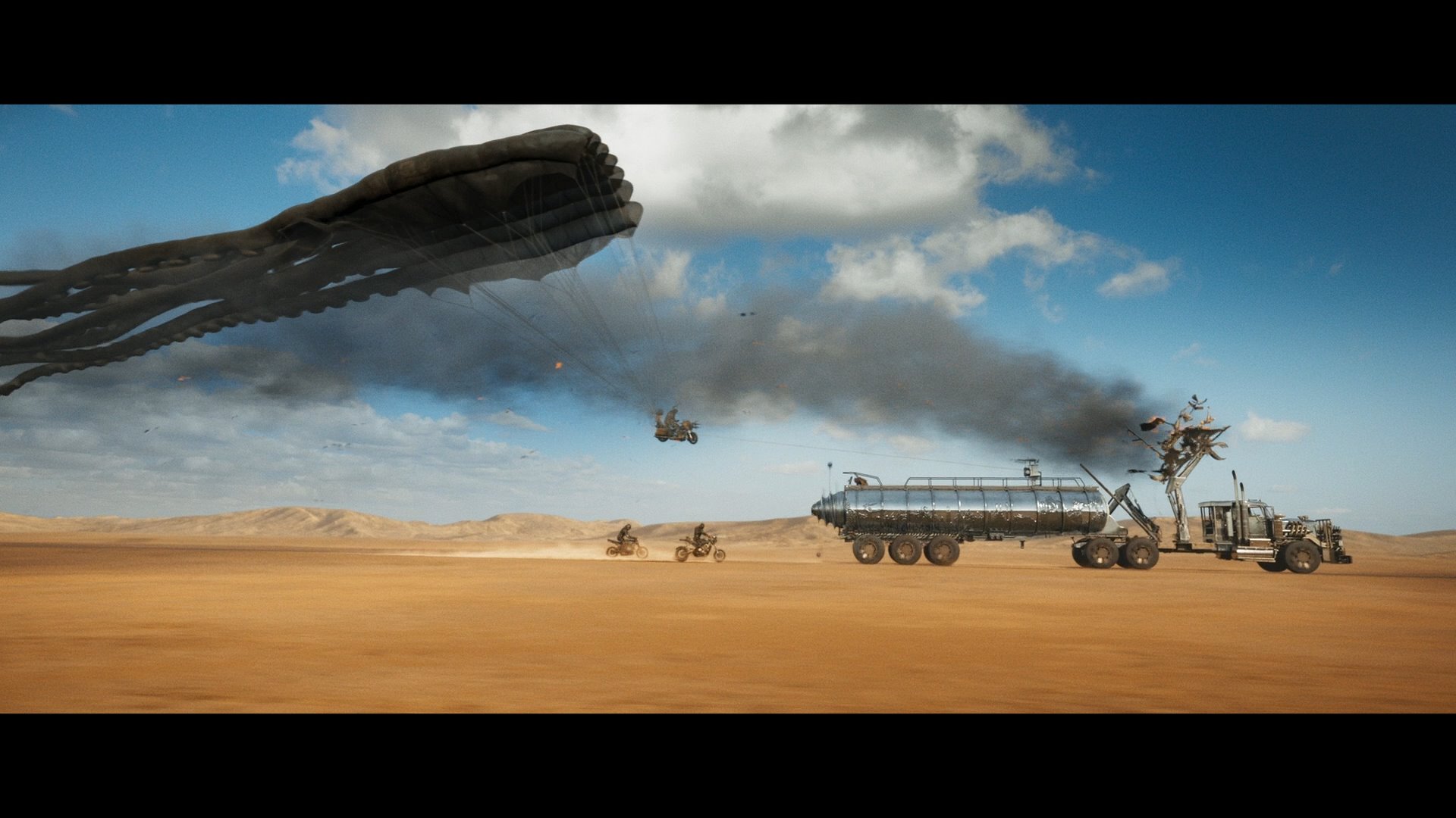 《疯狂的麦克斯:狂暴女神》是一部在视觉和叙事上都极具野心的作品,它不仅延续了《疯狂的麦克斯》系列的后世界末日美学,更在此基础上勇于进行大胆的创新与探索。导演米勒再次展示了他对后世界末日荒凉美学的独到理解,影片中的沙漠、废墟和战斗场景以震撼人心的方式呈现,仿佛将观众置身于那个危机四伏的荒凉世界之中。同时,动作场面的设计精良,无论是高速追逐还是激烈的肉搏战,都充满着强烈的力量感和真实感,让人体验到肾上腺素的激增。